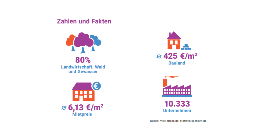 Der Landkreis Leipzig, ein Zusammenschluss des Muldentalkreises und des Landkreises Leipziger Land, überzeugt mit seinen zahlreichen Facetten. So entsteht etwa direkt an der Autobahn 14 das neue Grimmaer Gewerbe- und Industriegebiet. „Mit dem Spatenstich der ersten Firma nimmt die Entwicklung nun sichtbare Fortschritte an“, erklärt Oberbürgermeister Matthias Berger. „Zahlreiche weitere Ansiedlungen folgen in den kommenden Jahren. Wir erhoffen uns rund 1000 Industriearbeitsplätze für Grimma und die Region.“